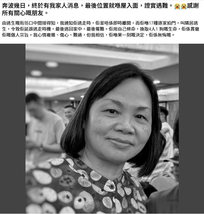 遇難者的丈夫說,事發時曾通知太太逃生,之後在街坊的口中得知,她當時未有即時離開,而是在樓層中逐家拍門通知鄰居,最終她本人未能逃走,躲回家中並罹難。發文者稱,太太以自己的生命換取4人1狗的生命,雖然心情複雜、傷心、難過,「但我相信,佢喺果一刻嘅決定,佢係無悔嘅。」